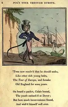 Page from Pug's Tour, published 1824, with hand-coloured illustration placed above the verse