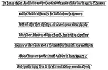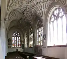 The Lane Chapel is a grand structure of five bays with large windows[5] and a magnificent fan-vaulted ceiling. Building work commenced in 1526 (as is stated on the lengthy inscription on the external walls), two years before Lane's death, was continued by his widow Thomasine and finished in 1552, according to an inscription on the exterior of the east wall.[6] It is profusely embellished in the interior on the ceiling corbels and bosses with relief sculptures of angels holding Lane's merchant's mark. The exterior walls are embellished with relief sculptures (now severely worn away by the elements) of biblical scenes and of items related to Lane and his trade,[7] such as ships, cloth shears, teasel frames, merchant's marks, monograms, etc. A lengthy relief-sculpted inscription in English in black-letter Gothic script runs around the three exterior walls of the building, low-down beneath the windows (see below).