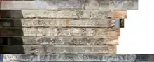 The following inscription, in parts much worn-away by the elements, is sculpted low-down on the outside wall of the aisle, running round all three sides of the building, with each word cut on detached stones:[13]