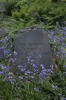 He died on 25 April 1996 whilst on holiday at Villa San Girolamo in Fiesole in Italy,[4][38] and in accordance with his wishes was "buried where he fell". In 2006, however, Cambell's body was repatriated and reburied in a birch wood planted by himself near St. Columba's Roman Catholic chapel on Canna. In 2008, a headstone was taken from the garden at Taynish House on the Inverneill estate, brought to Canna, and set in a small cairn, with the inscription:
