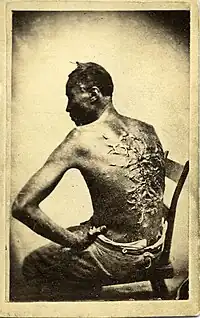 In spring 1863, an enslaved man by the name of Peter escaped Confederate-controlled Louisiana and made his way to the U.S. Army, which was operating under General Nathaniel P. Banks' General Order 12, Promulgation of the Emancipation Proclamation: "Officers and soldiers will not encourage or assist slaves to leave their employers, but they cannot compel or authorize their return by force."[33] A photograph of Peter's heavily scarred back and excerpts from his explanation of what had happened to him were widely promulgated to the general public by anti-slavery advocates.[1] Peter was reported to have said, on April 2, 1863:[34]