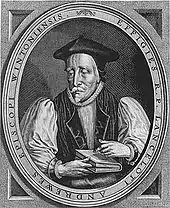 John Preston, the son of Thomas Preston, a farmer, and his wife Alice, daughter of Lawrence Marsh of Northampton, was born at Upper Heyford in the parish of Bugbrook, Northamptonshire. He was baptised at Bugbrook church on 27 October 1587.[1] His father died when he was 13 years old, and his mother's maternal uncle, Creswell, who was mayor of Northampton and rich and childless, adopted Preston, placing him at the Northampton Grammar School, and subsequently with a Bedfordshire clergyman named Guest for instruction in Greek. He matriculated as a sizar at King's College, Cambridge, on 5 July 1604, his tutor being Busse, who became master of Eton in 1606. King's College was then famous for the study of music; Preston chose 'the noblest but hardest instrument, the lute', but made little progress. In 1606 he migrated to Queens' College, where he had as tutor Oliver Bowles, B.D. Creswell had left him the reversion of some landed property, and he thought of a diplomatic career. With this view he entered into treaty with a merchant, who arranged for his spending some time in Paris, but on this merchant's death the arrangement fell through. Preston then turned to the study of philosophy, in which he was encouraged by Porter, who succeeded Bowles as his tutor. By Porter's interest with Humphrey Tyndall, master of Queens' and dean of Ely, Preston, who had graduated B.A. in 1607, was chosen fellow in 1609. From philosophy he now turned to medicine; got some practical knowledge under the roof of a friend, a physician in Kent, 'very famous for his practice'; and studied astrology, then valued as a handmaid to therapeutics.[1]