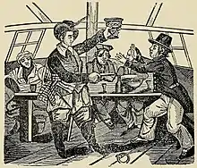 I was forced to tell him, I knew not of their design; and indeed I did not, tho' I had good reason to suspect what would be the event of their going. This did not pacifie the Quarter-Master, who with outragious Cursing and Swearing clapt his Pistol to my Head, and snap'd it; but it miss'd Fire: this enraged him the more; and he repeated the snapping of his Pistol at my Head three times, and it as often miss'd Fire; upon which he held it over-board, and snap'd it the fourth time, and then it went off very readily. … The Quarter-Master upon this, in the utmost fury, drew his Cutlash, and fell upon me with it, but I leap'd down into the Hold, and got among a Crowd that was there, and so escaped the further effects of his madness and rage.[5]