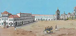 In the course of his few years living in Brazil, John ordered the creation of a series of institutions, projects and services that brought the country immense economic, administrative, juridical, scientific, cultural, artistic and other benefits, although not all went successfully, and some were downright dysfunctional or unnecessary, as Hipólito José da Costa mordantly observed.[48] Among these, he was responsible for establishing the Imprensa Régia (the country's first publishing house), the Rio de Janeiro Botanical Garden[69] the Arsenal de Marinha, the Fábrica de Pólvora (gunpowder factory),[70] Rio's fire department, Brazil's merchant marine, and the charity hospital known as the Casa dos Expostos.[71] He also established various educational programs in Rio, Pernambuco, Bahia and other places, teaching such subjects as dogmatic and moral theology, integral calculus, mechanics, hydrodynamics, chemistry, arithmetic, geometry, French, English, botany and agriculture, among others. He instigated the foundation of various societies and academies for scientific, literary and artistic studies, such as the Junta Vacínica (administering the smallpox vaccine), the Royal Bahiense Society of Men of Letters, the Academic Institute of Sciences and Fine Arts, the Fluminense Academy of Sciences and Arts,[72] the Escola Anatômica, Cirúrgica e Médica do Rio de Janeiro,[73] the Royal Academy of Artillery, Fortification and Design,[68] the Academia dos Guardas-Marinhas, the Academia Militar,[70] the National Library of Brazil,[74] the Royal Museum (now National Museum of Brazil),[75] the Teatro Real de São João (now Teatro João Caetano), as well as recruiting internationally famous soloists and patronizing other musicians of the Royal Chapel, including Father José Maurício, the leading Brazilian composer of his time,[71] supporting also the coming of the Missão Artística Francesa, which resulted in the establishment of the Escola Real de Ciências, Artes e Ofícios, predecessor of the present-day Escola Nacional de Belas Artes of the Federal University of Rio de Janeiro, of fundamental importance the renewal of teaching and art production in Brazil.[76]