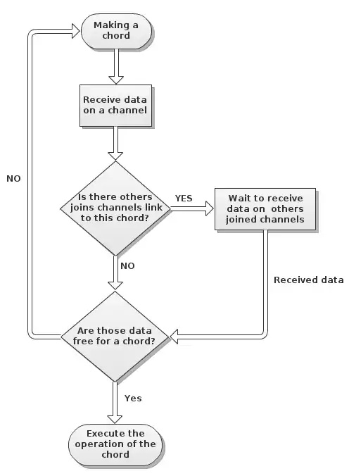 This flow diagram shows how the join pattern is executed by a general match with different channels (wait a chord) and synchronizes the resources (free or lock).