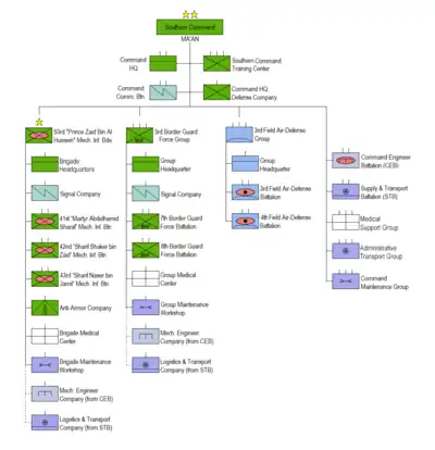 Jordanian Southern Command is the smallest regional command in JAF, this command defend 4 cities and consist of one Armoured brigade, one infantry brigade and other support units.[1] In 2000 the King Abdullah II made a big step to modernize and restructure Jordanian Armed Forces when the Divisions have been transformed into a lighter, more mobile forces, based largely on a brigade structure and considered better capable of rapid reaction in emergencies.[2][3]