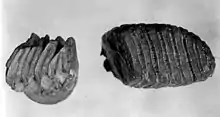 The walls of the molars are concave, and the molars are tightly packed together. Like other dinomyids, the occlusal (biting) surface of each grinding tooth has smooth and slightly curved lophs (ridges). The back lophs have a decently thick enamel coat, whereas the front lophs have next to no enamel. This, alongside a sparsity of interprismatic (between crystallic prisms of enamel) cementum, would suggest that the lophs are separated only by a thin layer of enamel.[2] This sloping enamel thickness and thin cementum layer are characteristic of the genus.[2][1]