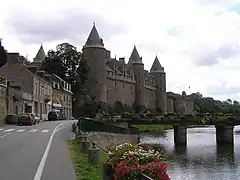 Josselin Castle (French: Château de Josselin, Breton: Kastell Josilin, Latin: Castellum Joscelini) is a medieval castle at Josselin, in the Morbihan department of Brittany, France, first built in 1008 by Guéthénoc, viscount of Porhoët. The town and castle were named after Guéthénoc's son, Goscelinus, and rebuilt at various times since. The current castle was built by Olivier V de Clisson after 1370. He had acquired the land as part of the dowry on his marriage to Margaret of Rohan.[1] It has been designated as a monument historique since 1928.[2]