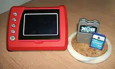 The Juice Box is a low-cost multimedia player made by toy manufacturer Mattel. The player features a 2.7 in (6.9 cm) screen with a native resolution of 240×160 px[1] and runs μClinux, a microcontroller version of the Linux kernel.[2] It was made and released in November 2004, and was discontinued in early 2005. It has 66 MHz ARM7TDMI architecture Samsung processor S3C44B0, 2 MBytes or 8 MBytes of RAM and 8MB of ROM. It was marketed as a portable media player for children (like its competitors VideoNow and Game Boy Advance Video).[3] The player only played a proprietary cartridge format. 4Kids Entertainment and Cartoon Network put some of their shows on cartridges. However, the small screen and poor quality (10 frames per second maximum) alienated most people.[4] Furthermore, the device entered a crowded market. Its rivals are the VideoNow and the Game Boy Advance, the GBA being the most potent. The difference is that GBA not only had TV shows (which can be played through Game Boy Advance Video cartridges), but could also play video games, as it was built for that. Thus many retail stores were left with a surplus of the device. Original retail price was about US$70.[5]