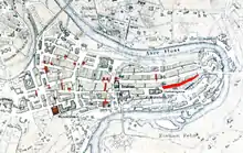 The Erlacherhof ("Erlach Court"), no. 47, is the most significant private building, in historical and architectural terms, of the Old City.[9] Built 1747–52 by Türler for Hieronymus von Erlach, it is the only application of Jacques-François Blondel's concept of palace entre cour et jardin – a palace between court and garden – in an urban setting.[9] As the city's greatest urban palace, the Erlacherhof served as General Guillaume Brune's headquarters in 1798, as the seat of the French Embassy to Switzerland until 1832, and as the first seat of the Swiss Federal Council and the federal administration from 1848 to 1857. It has since been used as the seat of the government of the city of Bern.[9] Part of its outer wall is the Bubenbergtor, a 12th-century city gate and the oldest building in Bern that is still standing.[10] The house opposite the Erlacherhof on Junkerngasse No. 38 belonged to the legendary Bond Girl Ursula Andress.