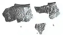 Eleven sherds representing a single vessel were present at Juntunen.[4] Ramey Incised is a Middle Mississippian pottery type first identified at the Cahokia Old Village site in southern Illinois. It has also been recovered at Carcajou Point in Wisconsin, but its presence at Juntunen marks the northernmost occurrence of any Middle Mississippian pottery type. Tempering is shell-tempered mixed with grit and decoration is a distinctive pattern of curvilinear designs. The vessel shape is thought to be a bowl with sharply defined shoulder. It was recovered in intermediate strata between the Bois Blanc and Juntunen Phases.[4][13]