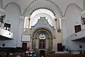 The interior of the centrally located synagogue is octagonal, 22.15 m in diameter with a smooth dome overhanging the walls at four points. Six cast-iron pillars hold the enclosed vault enclosed by a barrel vault.