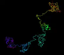 Tertiary Structure was predicted using I-Tasser where the purple represents the C-terminal and the red represents the N-terminal shown on the right.[17]