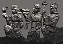 The adorants are dressed in knee-length tunics, with long boots over trousers, suggesting clothing styles similar to those found in the paintings of Penjikent, and wear shoulder ribbons which have been associated with Hephthalites nobility.[8] The gate is dated to the first half of the 6th century CE (500-550 CE), and the destruction of the palace is attributed to the Islamic conquest of Samarkand in 712 CE.[8][10]