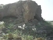 Nearby the upper caves, the top of the hill is surrounded by very ancient compound wall which is constructed with stones. The remains of ancient settlement and very old potsherds have been explored. The discovered earthenware or ceramic material refers to earlier Indus Valley civilisation while the period of caves has been considered as the Stone Age.[4] In the vicinity of Kai Valley, close to Kai Caves, the other sites of Bulo-Ji-Buthi, Nuko-Buthi, Kai-Buthi and Naig have been discovered belonging to prehistoric and Chalcolithic periods.[5] Dr. Louis Flam had visited the Kai Caves with native archaeologist Taj Sehrai in 1976.[6]