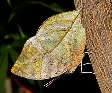 The tips of the forewings are pointed, while the tips of the hindwings extend into a short narrow tail, resembling leaf petioles. Running through the middle of both forewings and hindwings is a line, dark on one side and light on the other, representing the shaded and illuminated sides of a leaf midrib.[17] From this line are fainter lines radiating forwards and resembling the secondary venation of leaves.[15] Part of it is achieved through markings, and part through the incorporation of the actual venation of the wing. The head and the antennae fit exactly into the curve of the closed upper wings so as not to interfere with the outline. The resulting minor irregularities themselves resemble the wrinkled edges of withered leaves.[13][18]