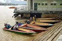 Kampong Ayer has an extensive network of walkways on stilts and pedestrian bridges connecting the houses and other buildings. They are built of wood, concrete or with metal stilts. For neighbourhoods without connecting walkways due to being separated by wide waterways, mobility is done by motorboats. The boats are usually made of wood and in traditional local style, but installed with engines. They are commonly known as perahu tambang (translated as 'water taxis') as trips are charged with fares similar to car taxis.[3] The boats may also transport passengers between the land and the neighbourhoods not on the riverbanks.