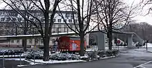 The Karlssteg is a 136.5 meter long footbridge of tension construction in Freiburg im Breisgau, Germany. A concrete strip only 25 cm thick with 60 continuous tension elements leads from Karlsplatz to the Stadtgarten. In high temperatures, the tension band can sag up to 40 cm. Construction of the bridge began in 1969; in January 1970, the columns were already standing, and in June, for the city's 850th anniversary, the Karlssteg Bridge – constructed by the engineer H.Nehse – was opened to traffic as the first bridge of its kind in Germany. In the same year, the Mozart, Hermann and Schwabentor bridges were opened, though in a less spectacular way, passing over Mozartstraße (Mozart Street) and Schlossbergring.