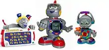 In 2002 Fisher-Price introduced the Kasey the Kinderbot (pictured center, voiced by Kamala Kruszka) Educational line of toys that was capable of teaching 40 learning skills to pre-schoolers including basic math, reading, and science.[4] "Kasey, which speaks English, Spanish, and French was Fischer-Price's first preschool electronic learning aid, a category of toys that has ballooned in recent years as parents scramble to give their children an edge well before they enter preschool".[4] Kasey has moving eyes, head, waist, arms and hands all of which are coordinated to its voice and LCD display screen. According to Fisher-Price Kasey incorporated the use of a special learning circuit for reinforcement and education.[5]