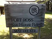 Fort Ross sign with Kashaya placename /mé·ṭiʔni/, anglicized as "May-tee-nee"