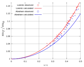 Kaufmann noticed that the observed increase cannot be explained by this formula, so he separated the measured total mass into a mechanical (true) mass and an electromagnetic (apparent) mass, the mechanical mass being considerably greater than the electromagnetic one. However, he made two mistakes: As shown by Max Abraham, Kaufmann overlooked that Searle's formula only applies in the longitudinal direction, but for deflection measurements the formula for the transverse direction was important. Therefore, Abraham introduced the "transverse electromagnetic mass" with the following velocity dependence: