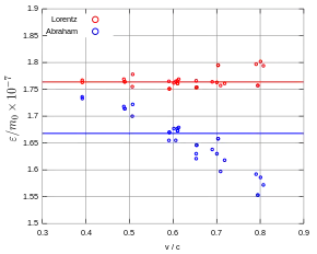 Kaufmann published a first analysis of his data in 1901 – he actually was able to measure a decrease of the charge-to-mass ratio, thus demonstrating that mass or momentum increases with velocity.[6] Using Searle's formula (1897) for the electromagnetic energy increase of charged bodies with velocity, he calculated the increase of the electron's electromagnetic mass as a function of velocity: