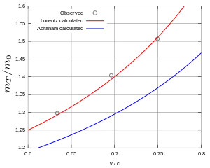 The Kaufmann–Bucherer–Neumann experiments measured the dependence of the inertial mass (or momentum) of an object on its velocity. The historical importance of this series of experiments performed by various physicists between 1901 and 1915 is due to the results being used to test the predictions of special relativity. The developing precision and data analysis of these experiments and the resulting influence on theoretical physics during those years is still a topic of active historical discussion, since the early experimental results at first contradicted Einstein's then newly published theory (1905),[1] but later versions of this experiment confirmed it. For modern experiments of that kind, see Tests of relativistic energy and momentum, for general information see Tests of special relativity.