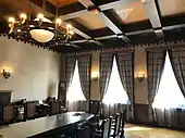 The Dukes' Hall is located in front of the Great Hall. It reused furniture and chandeliers from the old club building.[3] It is dedicated to the Grand Dukes of Lithuania and King Mindaugas. Their full-length portraits were completed in 1937 by Petras Kalpokas. After World War II, the paintings were missing for many years. They were unexpectedly found in the Vytautas the Great War Museum – removed from the frames and rolled up they were inventoried as "unknown paintings of dukes".[7] The paintings depict King Mindaugas, Grand Dukes Vytenis, Kęstutis, Gediminas (father of the Gediminids dynasty), Algirdas, and Vytautas the Great. The painting of Gediminas was severely damaged, and it is believed that Soviet soldiers used it to play darts.[6]