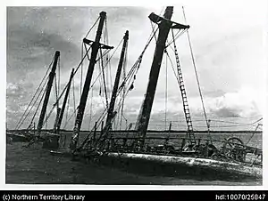After being requisitioned by the RAN, she was towed from Fremantle to Darwin fully laden with coal in February 1942. She sank at her mooring several days after arriving in Darwin after being machine gunned and badly damaged during the Japanese air raid on Darwin on 19 February 1942. The sinking may have been by neglect as in the confusion after the raids it is possible no one remembered to continue to run her pumps to keep her afloat.[4] Her wreck is located at 12°02′00″S 130°05′00″E / 12.03333°S 130.08333°E.