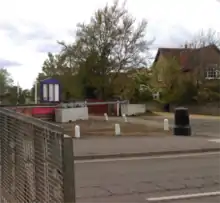 The entrance to the Robert Bruce School site, as it appeared in April 2019. The southern terminus of the Kempston gravel railway is likely to have been to the left of the row of trees.