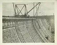 Before constructing the existing Kensico Dam, the old Kensico Dam had to be removed; this began in 1911.[8] The construction of the new dam began in 1913 and was concluded in 1917—three years ahead of schedule—at a cost of more than $15,000,000.[11][12] The dam is 1,843 feet (562 m) long, stands 307 feet (94 m) above its foundation, and is able to hold back about 30 billion US gallons (110,000,000 m3) of water. It contains 1 million cubic feet (28,000 m3) of masonry—as much masonry as the Egyptians used to build some of the pyramids. In one month, 2.5 million cubic yards of concrete were placed into block-shaped forms,[13][14] which had to cure for three months before being swung onto the rising hyperbolic pile of dam.