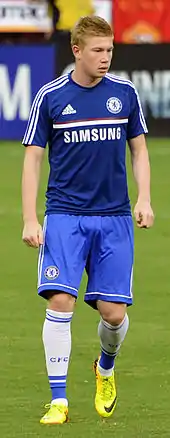 De Bruyne injured a knee while scoring his first goal for Chelsea, in a pre-season friendly game against a Malaysia XI,[29] but was fit to make his competitive debut on the opening day of the 2013–14 Premier League season against Hull City, and made an assist for the first goal in a 2–0 win.[30]