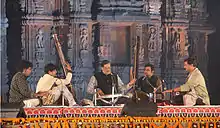 Khyal singer Ajoy Chakrabarty performing at the Rajarani Music Festival. He is accompanied by two tanpura players, a harmonium player and a tabla player.