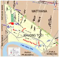 Khlong Toei (also Klong Toey, Thai: คลองเตย, pronounced [kʰlɔ̄ːŋ tɤ̄ːj]) is a district in central Bangkok, long known for its slum. It is bordered by the Chao Phraya River and contains major port facilities. It is also the site of a major market, the Khlong Toei Market.