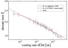 A system, where structure formation can be visualized directly is given by a colloidal mono-layer which forms a hexagonal crystal in two dimensions. The phase transition is described by the so-called Kosterlitz–Thouless–Halperin–Nelson–Young theory where translational and orientational symmetry are broken by two Kosterlitz–Thouless transitions. The corresponding topological defects are dislocations and disclinations in two dimensions. The latter are nothing else but the monopoles of the high-symmetry phase within the six-fold director field of crystal axes. A special feature of Kosterlitz–Thouless transitions is the exponential divergence of correlation times and length (instead of algebraic ones). This serves a transcendental equation which can be solved numerically. The figure shows a comparison of the Kibble–Zurek scaling with algebraic and exponential divergences. The data illustrate, that the Kibble–Zurek mechanism also works for transitions of the Kosterlitz–Thoules universality class.[22]