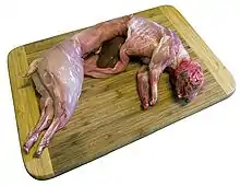 Halāl (Arabic: حلال ḥalāl, 'permissible'), also spelled "hallal" or "halaal", is any object or an action which is permissible to use or engage in, according to Islamic law. The term covers and designates not only food and drink but also all matters of daily life.[18] There are three ways of halal killing: slitting of the throat (dabh), plunging the knife into the dimple over the breast bone (nahr), and killing in some other way ('aqr). The name of God (bismillah) must be said before killing the animal. The killing must be swift and with no prior stunning of the animal being killed.[19] Blood must be drained out of the carcass.[20]
