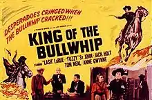 King of the Bullwhip is a 1950 American Western film produced and directed by Ron Ormond starring Lash LaRue and Al "Fuzzy" St. John. It was the eighth of LaRue's films for Ormond's Western Adventures Productions Inc.[1] The film was the second to be released by Howco, Ron Ormond's new film company composed of Ormond and drive-in movie owners Joy N. Houck and J. Francis White, and Ormond's first film as director. The screenplay is co-written by Jack Lewis and Associate Producer Ira S. Webb. Jack Holt and Tom Neal return from the previous film but in different roles. The film was shot at the Iverson Movie Ranch.