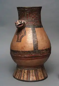 In the Greater Nicoya there was a constituted cultural center that flourished for approximately 2000 years.[4][5] Archaeological research shows that the Nicoyan society achieved a complex social organization and a high degree of cultural development. Upon the arrival of the Spaniards into Nicoya in the 16th century, they found complex cities and governments, specialized agriculture that included irrigation, arts and crafts, highlighting the triad of polychrome ceramics (whose tradition has been inherited by Guanacastecan artisans to this day), the making of jewelry from jade and the manufacture of stone metates, with various regional styles. For 1200 years, the Nicoyan cultural tradition in Guanacaste was clearly established as a distinctive entity.[6][7]