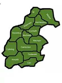- Cantrefs south of the Rhaeadr (Cyfeiliog, Ystlyg, and Caereinion) were allocated to Owain, Prince of Powys Wenwynwyn, (subsequently Owain Cyfeiliog), the son of Madog's deceased brother
