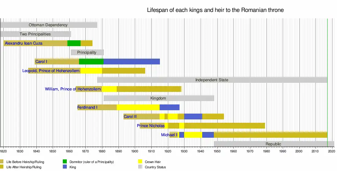 | 25 October 1921 – 5 December 2017 (aged 96) | 6 September 1940 | 30 December 1947 | Son of Carol II; Restored | Hohenzollern-Sigmaringen | ![]() |