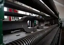 The weight can be varied in increments of 50 pounds (23 kg) using slotted plates on a hanger. On the lower scale this reads up to 150 pounds (68 kg), and up to 1,000 pounds (450 kg) can be put onto the hanger. A separate jockey weight system above this one allowed the machine to measure loads of up to 1,000,000 pounds (450 t).[1]