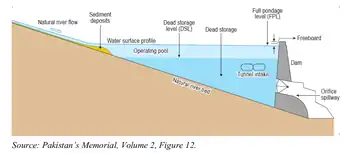 - ↑ The 'dead storage' as defined in the IWT is the water storage in the dam's reservoir above the level of inlets, used for power generation, with adequate submergence to facilitate smooth water inflow. The storage above this level is called 'live storage'. While the live storage fluctuates, the dead storage stays in the reservoir and accumulates sediments that wash down from upstream if not able to pass downstream. The recommended international practice is to flush the dead storage periodically to clear the coarse sediments accumulated in the reservoir.[22]