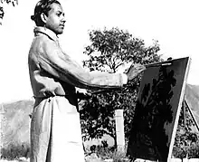 Roy also painted murals for the Ramgarh Palace, in present-day Jharkhand and Chitra Cinema Hall, Kolkata. His portraits of contemporary luminaries such as Sir N. N. Sarkar, Pramathesh Barua, Lalit Mohan Sen, his teacher J. P. Gangooly, novelist Sarat Chandra Chattopadhyay, and others and self-portraits including the famous Art and Famine are well known.[3][4][5] He exhibited widely in Calcutta, Delhi and Bombay.[2]