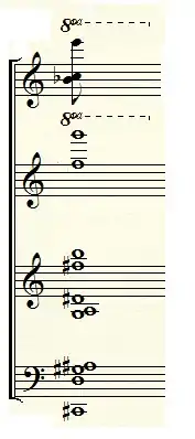 The work has a fundamental chord which works as a building block in harmonic sense for the entire work. All other chords and harmonies are derived from this chord. The chord, depicted as figure 1, is made out of combinations of dominant seventh chords, combined with each other. The result is a harmonic language which sounds chromatic and dissonant, but still gives a feeling of movement (Zuidam 40).