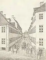 The street name refers to St. Clare's Monastery which was established at the eastern end of the street in 1493. The name is known from at least 1518 when a document mentions "Albritt van Gocks bod her, som nu kallis Clare bodher" ("Albritt van Gock's houses which are now called Clar'e houses". Later in the century the street was variously referred to as "Clara Stræde" (Clara's Alley) and "Clara boder".[1] The monastery closed after the Reformations and its buildings were used for a time for other purposes before its site was builtover between 1631 and 1650.