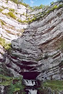 At the strata boundaries of steep Jurassic rock faces – such as those of the Albtrauf or the Swiss-French Jura – strong permanent or periodic karst springs have scoured out steep, often concave, vertical rock niches, for example: the Teufelsklinge near Heubach (on the Albtrauf of the Ostalb) and the Résurgence in the French Jura (source of the Loue).