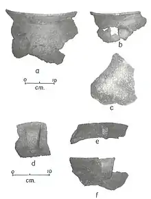 This combination of traits indicates that the Au Sagaunashke Component is intermediate in time between the Hoxie Farm and Huber sites, with Hoxie Farm coming first, Au Sagaunashke Component second and Huber last. The only exception to this would be with respect to the fine-line incising, which is a very late trait. The reason for this may be bias due to the smaller sample size; the Au Sagaunashke Component was composed of only 1,015 sherds compared with 6,077 sherds from Huber and over 12,000 sherds from Hoxie Farm.[1][10]