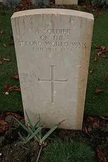 The phrase "Known unto God" forms the standard epitaph for all unidentified soldiers of the First World War buried in Commonwealth War Graves Commission (CWGC) cemeteries.[1][2] The phrase is engraved towards the bottom of the gravestone. The first line of text on the stone is a description of the deceased, which may be little more than "A soldier of the Great War"; the centre shows a cross, though the deceased's actual religious affiliation may be unknown; and the top an appropriate unit badge where known.[1][3] The phrase appears on more than 212,000 CWGC gravestones around the world.[4]