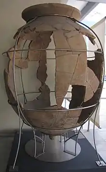Clay pots, pithoi (πίθοι), in which the wine was stored were buried in the ground. In total, 32 of these vessels were found. The height was 2.15 meters, the diameter 1.60 meters, the material was 3 - 4 cm thick. The capacity was nearly 2000 liters. One of these pithoi is exhibited in the Archaeological Museum of Thessaloniki. Furthermore, lead clamps for repairing the vessels, clay lids, grape seeds and resin were found.[4]