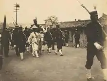 After Sunjong became emperor, the Japan–Korea Treaty of 1907 was signed. Under the treaty, more Japanese were employed in the Korean government and started to intervene in Korean affairs more.[39] Forces of General Hasegawa garrisoned the palace. Some regiments of the Imperial Korean Army were disarmed. The Pyeongyang Jinwidae, which was the elite unit of the Imperial Korean Army, was disarmed.[38] Starting this reduction of Jinwidae, many regiments of the Imperial Korean Army were dissolved starting from 31 July 1907.[40] These Japanese interventions fueled the righteous armies and various local peasant militias to fight against the Japanese. These righteous armies fought against Japan with little success.[41] From 1909, the Japanese suppressed all of the righteous armies. Many members of the righteous armies fled to Manchuria or to the rest of China to join the Independence Army.[42]